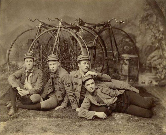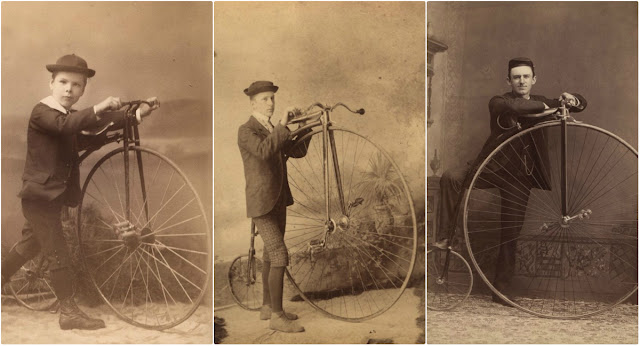 Они назывались "penny-farthing" или "high wheel" (high wheeler), но, по сути, были первыми машинами, получившими название "бисиклета" (bicycle). Были очень популярны в 1870е и 1880е, так как переднее колесо, проезжавшее большее расстояние благодаря всего одному нажатию педали, придавало машине хорошую скорость. Велосипеды были также комфортабельными, так как колесо спереди лучше поглощало удары неровностей дороги.