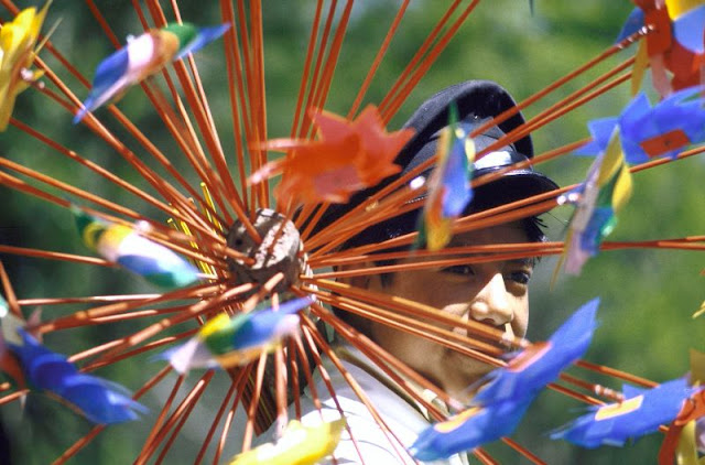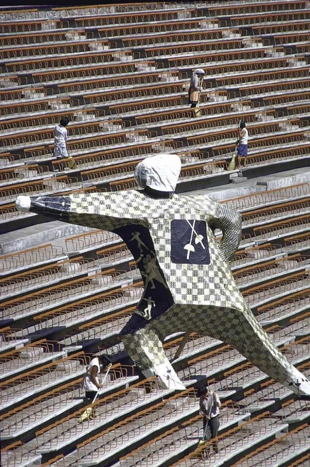 | 15-feet plastic fencer in en garde position erected in the stands at Aztec Stadium for Olympic Games. |
