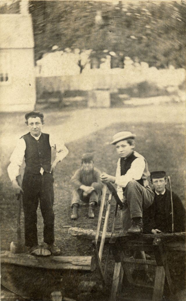 | A group of boys armed with saws and an ax show off their woodcutting skills in the backyard |