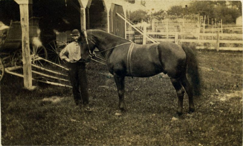 | A bearded man wearing shirtsleeves and a derby stands beside a male horse, Springfield, Massachusetts |