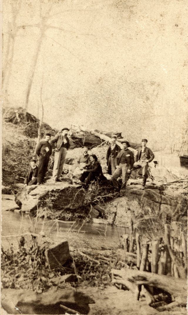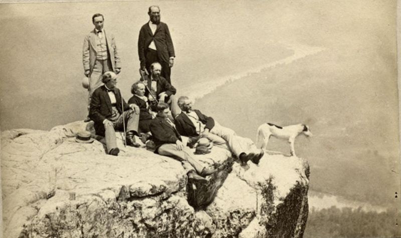 | Seven men and an intrepid dog are perched on top of Lookout Mountain, Tennessee |