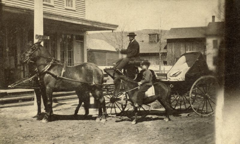 | Inscribed on the back of this portrait of a couple in a carriage pulled by two horses is “Mrs. & Mr. Hunt, Proctorsville, Vt.” |