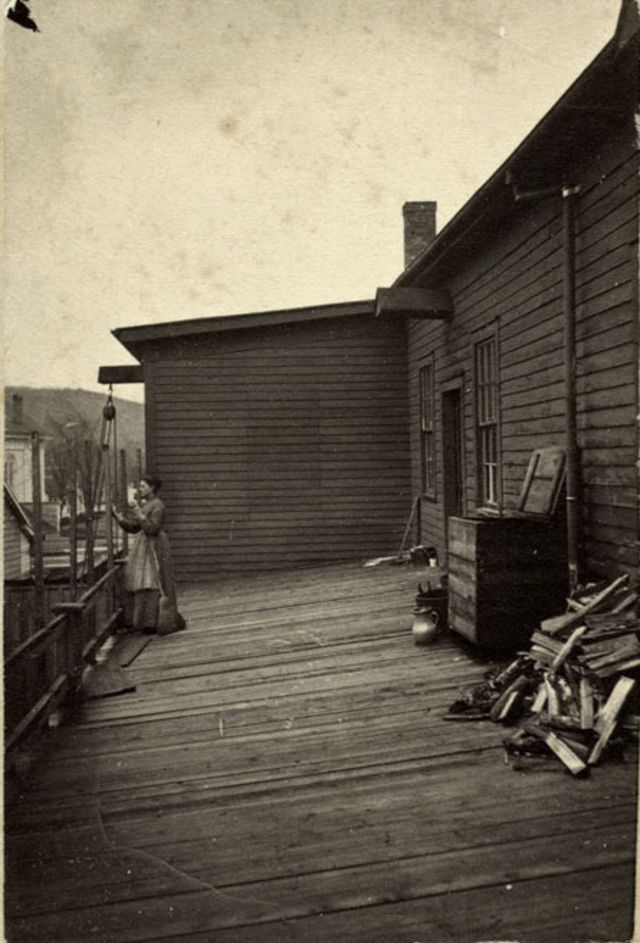 | A woman with her hair pulled back in a bun, wearing an unadorned dress and apron with striped pattern, stands on a wood-planked terrace, Lee, Massachusetts |