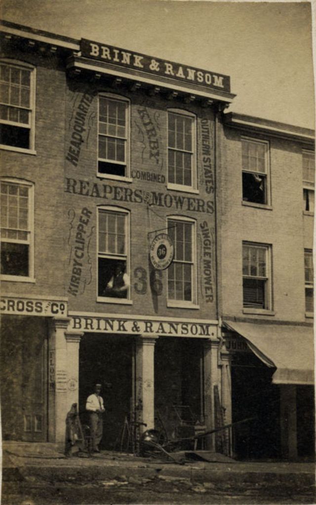 | One gentleman stands outside, and another sits upon a second floor window sill, at the establishment of Brink & Ransom, dealers in reapers and mowers, on Second Street in Louisville, Kentucky |