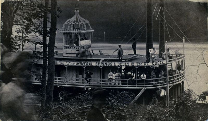 | About twenty-five people stand on the decks and inside the pilot's house of the “G.B. Knapp” at the St. Croix River |