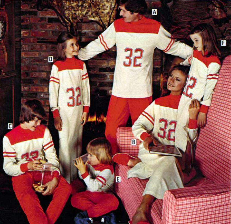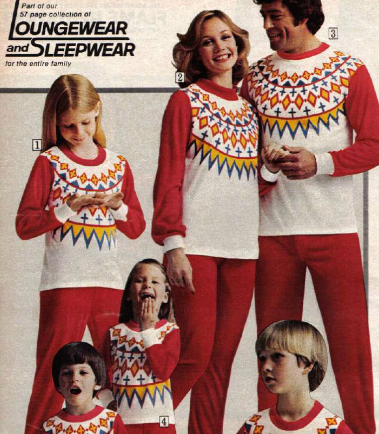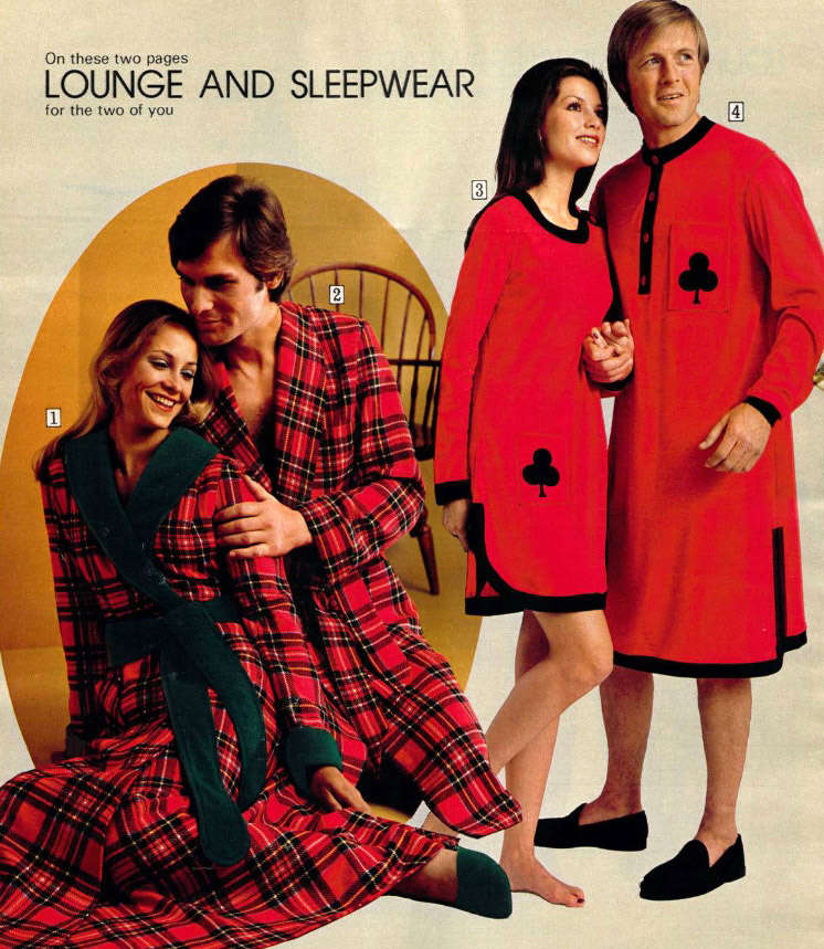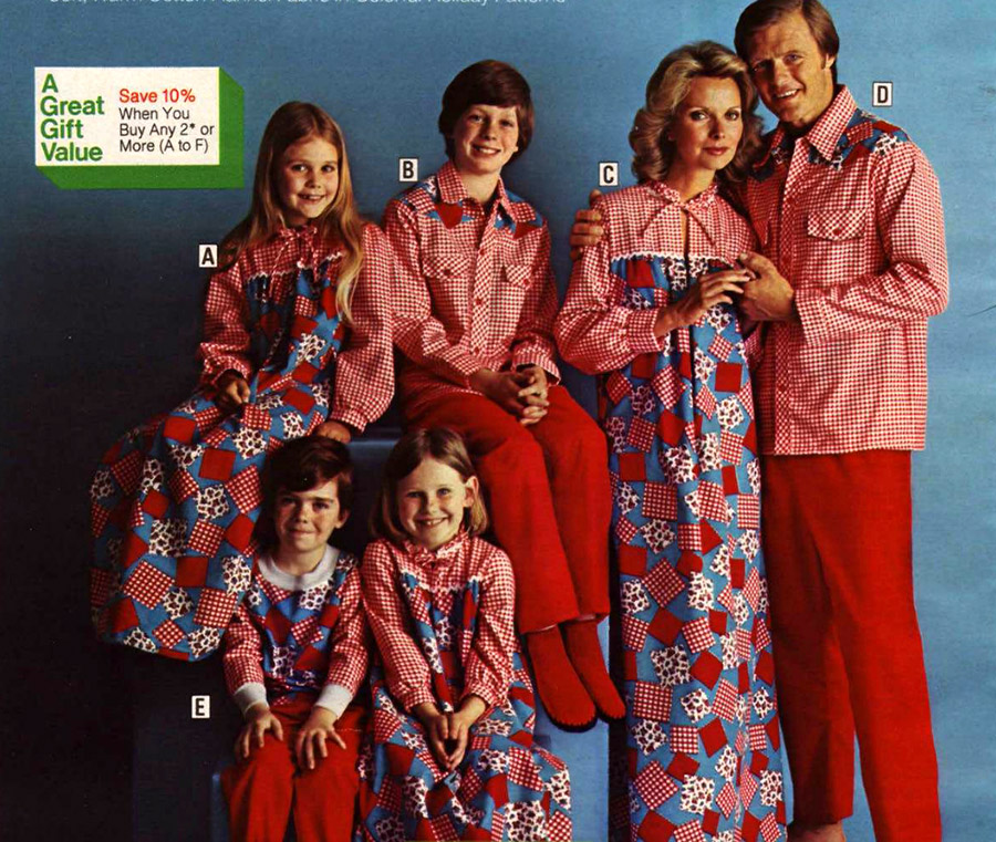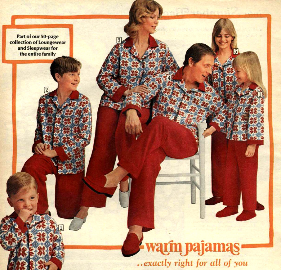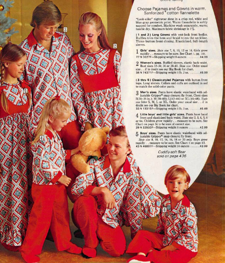Сирс (все магазины этого бренда закрывались в Канаде (В Манитобе и Квебеке) на моих глазах и Джей Си Пенни предлагали этот праздничный наряд в своих Рождественских каталогах год за годом на протяжении более десяти лет в 1970-х годах.