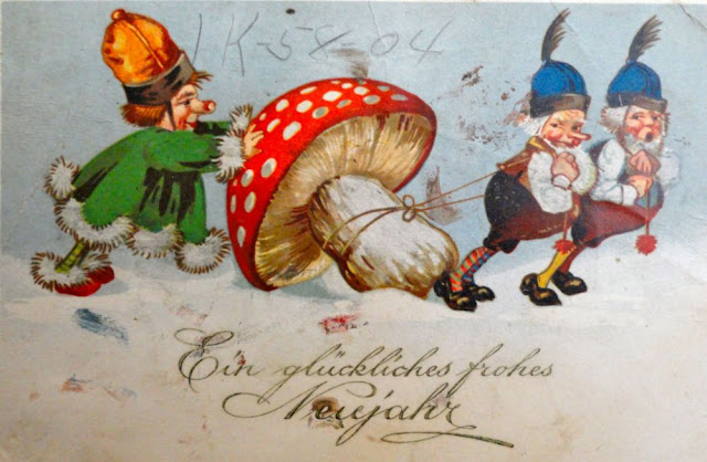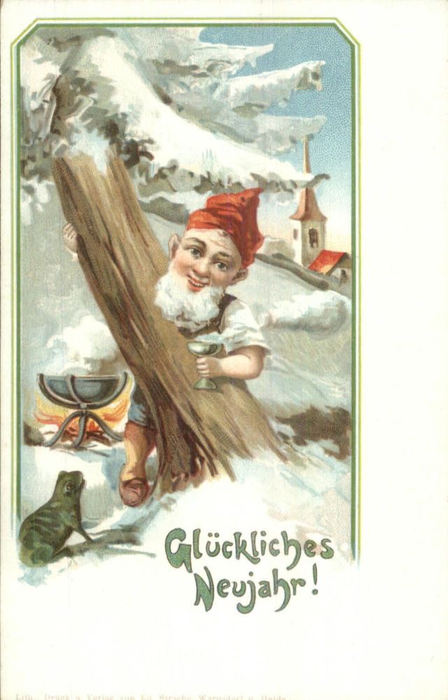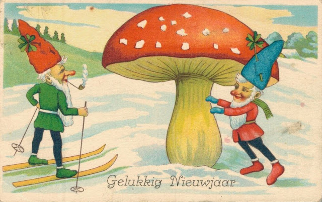 На открытках, среди прочего, есть также довольно много изображений бородатых гуманоидов. Карты с гномами обычно создавались для скандинавов. Эти волшебные миниатюрные существа-символы удачи. Другие европейские страны включили своих волшебных существ (эльфов, гномов и тому подобное) в свои новогодние открытки.