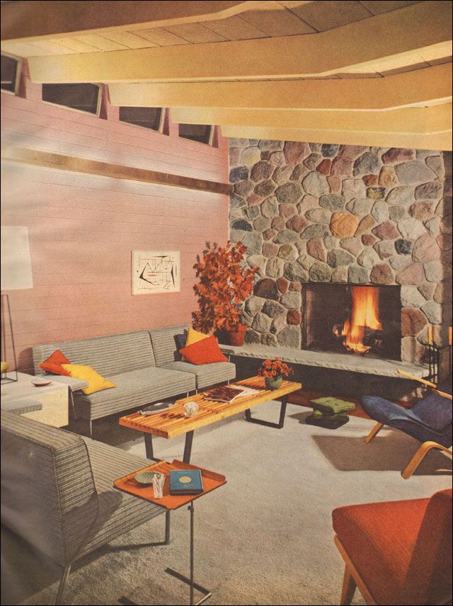 В гостиных преобладала мебель из ламинированной фанеры с чистыми линиями, а домашние бары стали важным элементом жилого пространства, поскольку особое внимание уделялось развлечениям. Мебель для отдыха на свежем воздухе появилась вместе с увеличением количества свободного времени, и появилась новая потребность в мебели для отдыха на природе и инвентаре для пикников.