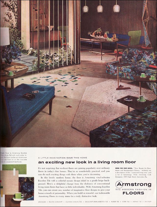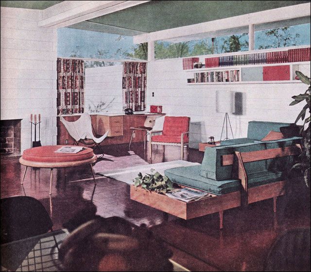 В гостиных преобладала мебель из ламинированной фанеры с чистыми линиями, а домашние бары стали важным элементом жилого пространства, поскольку особое внимание уделялось развлечениям. Мебель для отдыха на свежем воздухе появилась вместе с увеличением количества свободного времени, и появилась новая потребность в мебели для отдыха на природе и инвентаре для пикников.
