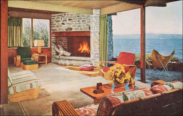 В гостиных преобладала мебель из ламинированной фанеры с чистыми линиями, а домашние бары стали важным элементом жилого пространства, поскольку особое внимание уделялось развлечениям. Мебель для отдыха на свежем воздухе появилась вместе с увеличением количества свободного времени, и появилась новая потребность в мебели для отдыха на природе и инвентаре для пикников.