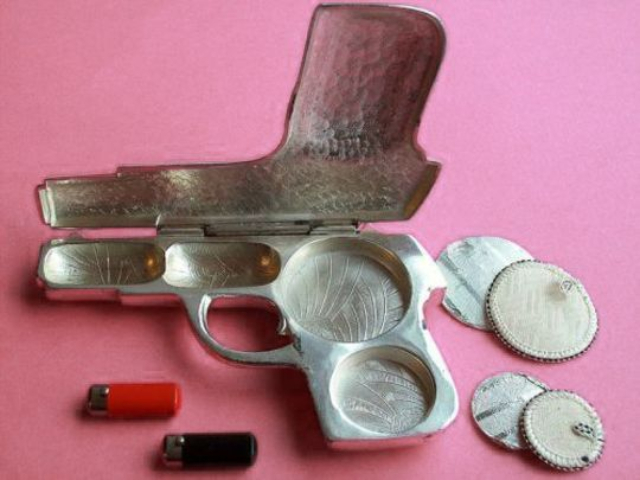 Такие косметички, задуманные как средство самообороны, были выполнены в форме неработающего пистолета; в них входили пудра, румяна для щек и губная помада в форме пули.