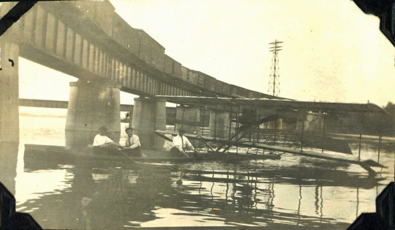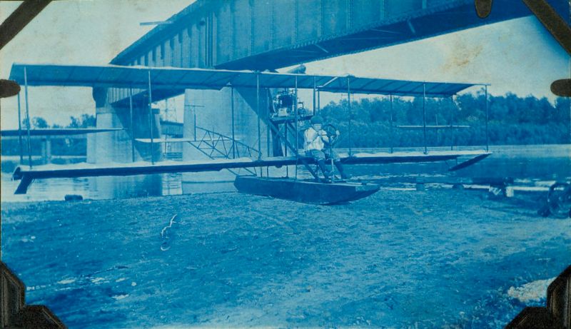| Oscar A Solbrig's daugher Hope seated in her father's hydroaeroplane under Crescent railroad bridge, Davenport, Iowa, circa 1914 |