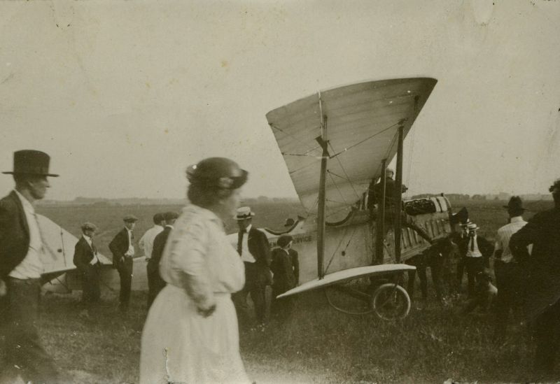| Mechanic hand propping plane at flying exhibition. Location may be Clinton, Davenport, or DeWitt, Iowa. Female aviator unidentified (possibly Katharine Stinson or Ethel Dare), circa 1914 |