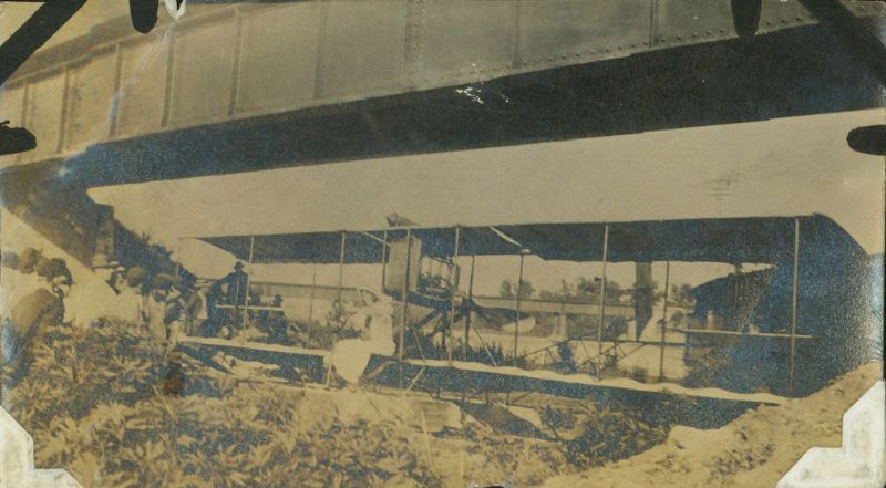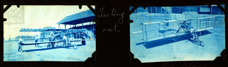 | Two views of Oscar A. Solbrig testing his Curtiss pusher biplane at the Mile Race Track, Davenport, Iowa, circa 1914. Photo at left shows Solbrig's wife Mary, an airplane mechanic, guiding the wing |