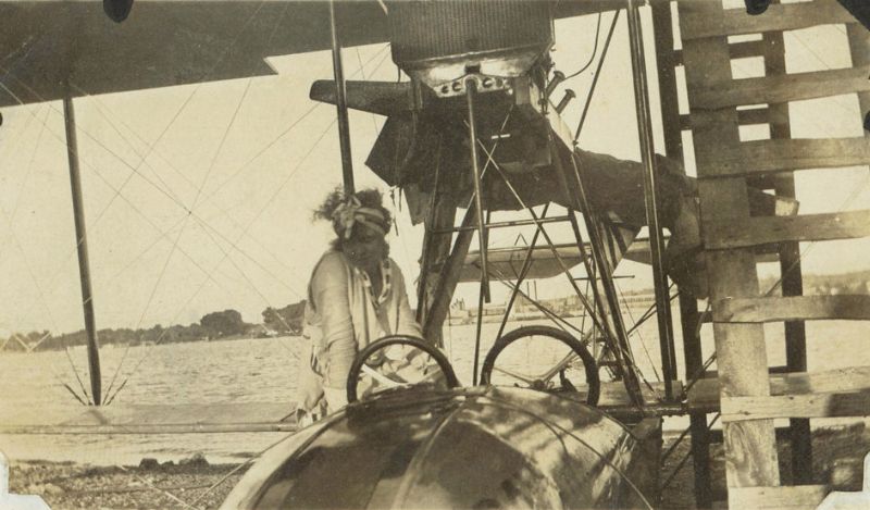 | Oscar A. Solbrig's wife Mary with Curtiss hydroaeroplane. Mary served as Oscar's mechanic, or as she preferred to be described "mechanician". Presumed to be Davenport, Iowa, circa 1914 |