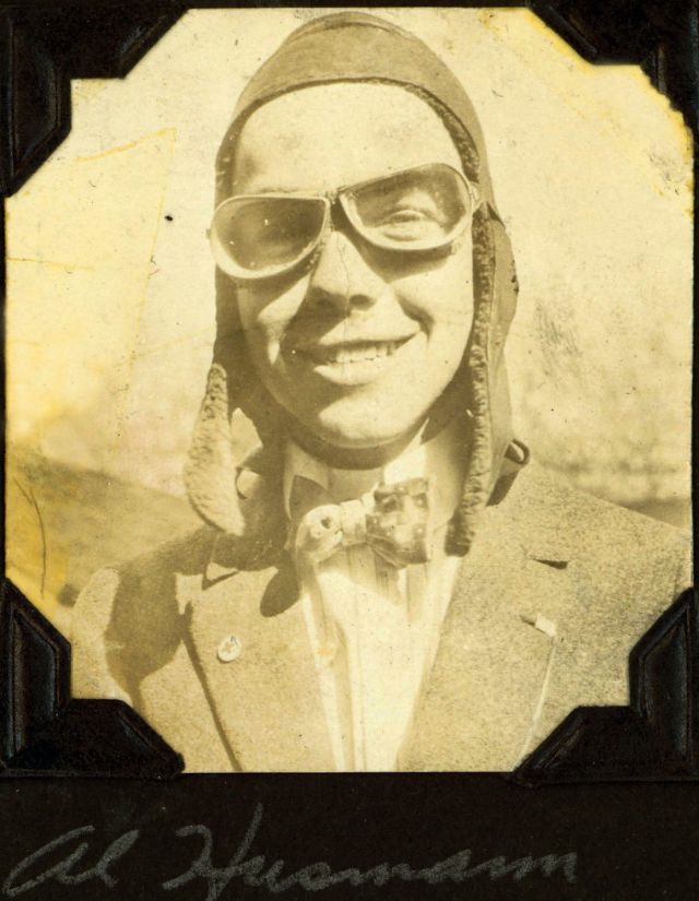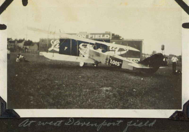 Оскар Солбриг прошел обучение в летных школах Гленна Кертисса в Хаммондспорте, штат Нью-Йорк, и Сан-Диего, штат Калифорния, и к 1914 году успешно летал на своем самодельном биплане Curtiss pusher над городом Давенпорт. Его жена Мэри служила его механиком и сопровождала его на выставках. Помимо Солбригов, Альфред Хусманн имел возможность видеть Линкольна Бичи, Рене Саймона, Кэтрин Стинсон и Чарльза Линдберга на выставках в Квад-Сити, а в своих воспоминаниях он сообщает, что однажды обслуживал на своей станции автомобиль Stanley Steamer Амелии Эрхарт, когда она направлялась из Сидар-Рапидс в Чикаго. Фотографии в этом альбоме из Государственного исторического общества Айовы представляют собой выборку снимков из фотоальбома (на самые разные темы), принадлежавшего Альфреду Хусманну. |