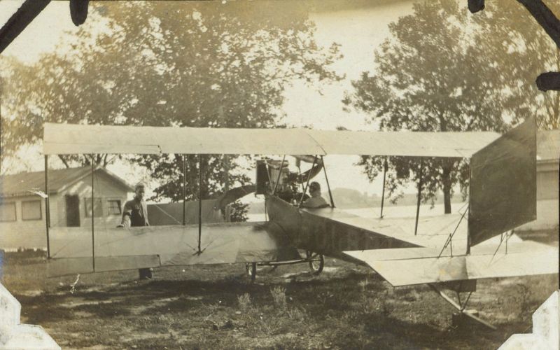 | Alfred Husmann seated in Oscar A. Solbrig's Curtiss pusher biplane, presumed to be Davenport, Iowa, circa 1914. Gentleman pushing plane unidentified, may be Solbrig's son Alfred |