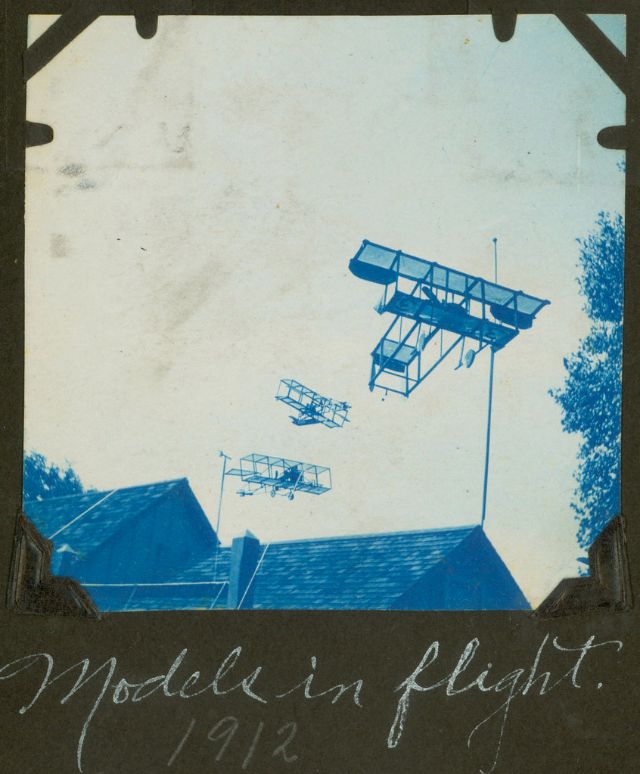 Model airplanes in flight, 1912. These probably belonged to the Oscar Solbrig family |