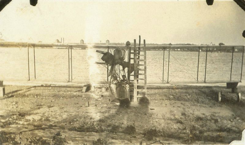 | Mary and Oscar A. Solbrig in hydroaeroplane beside Mississippi River, presumed to be Davenport, Iowa, circa 1914 |