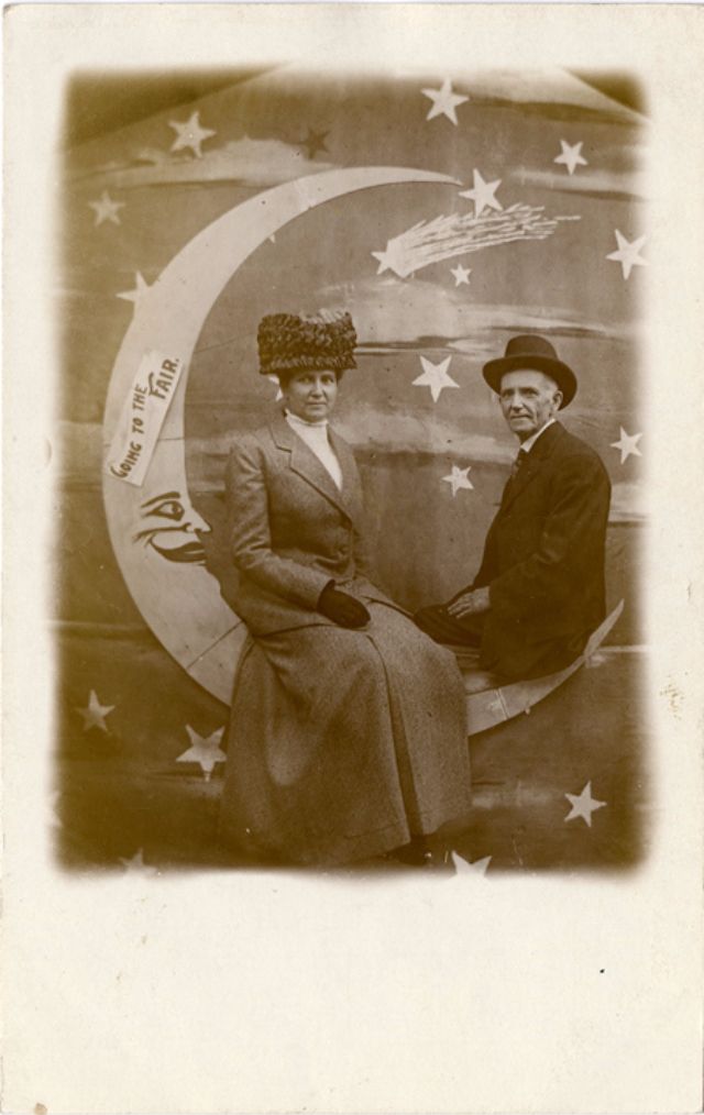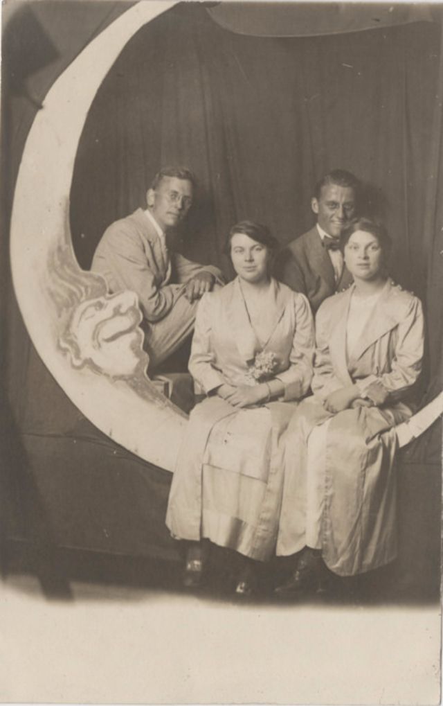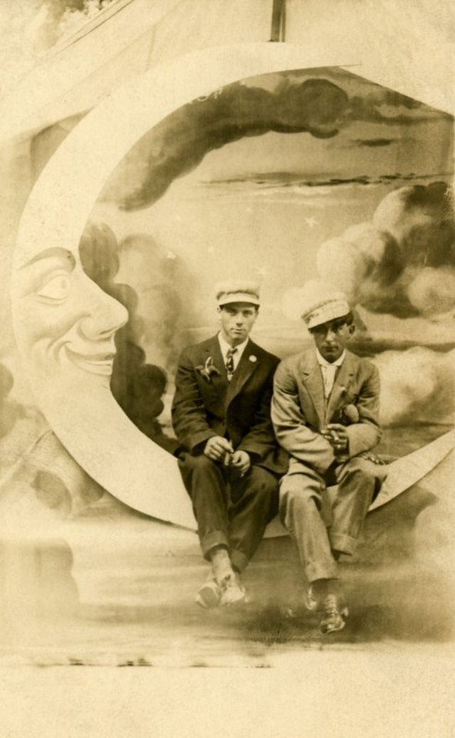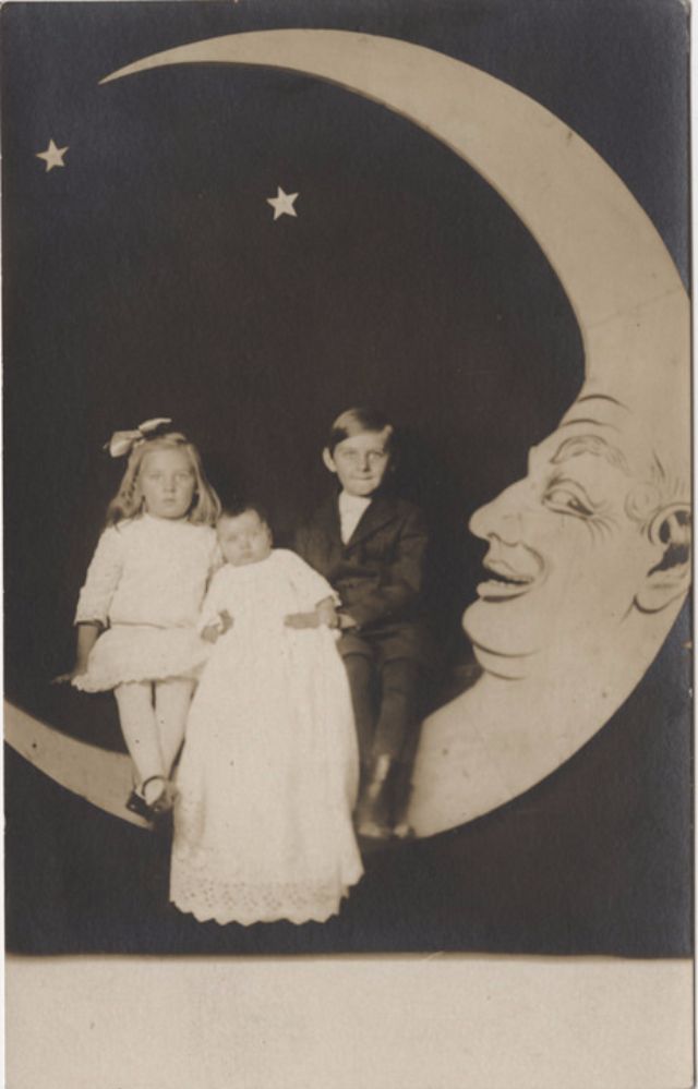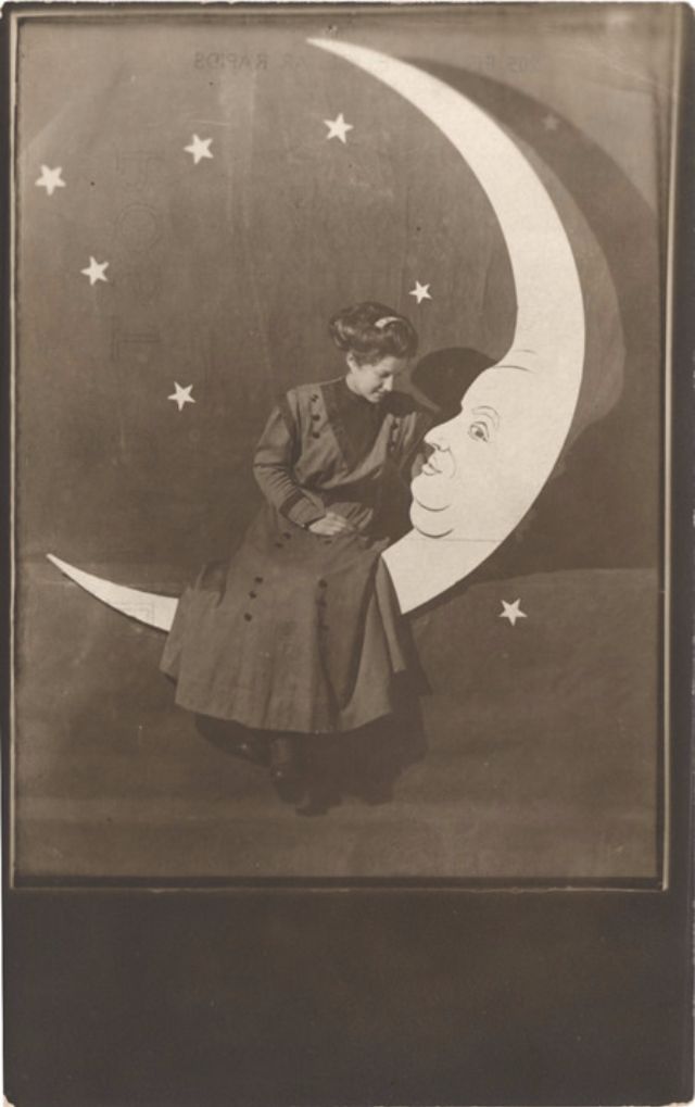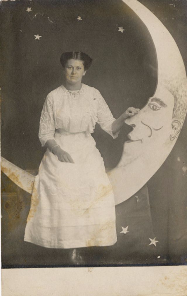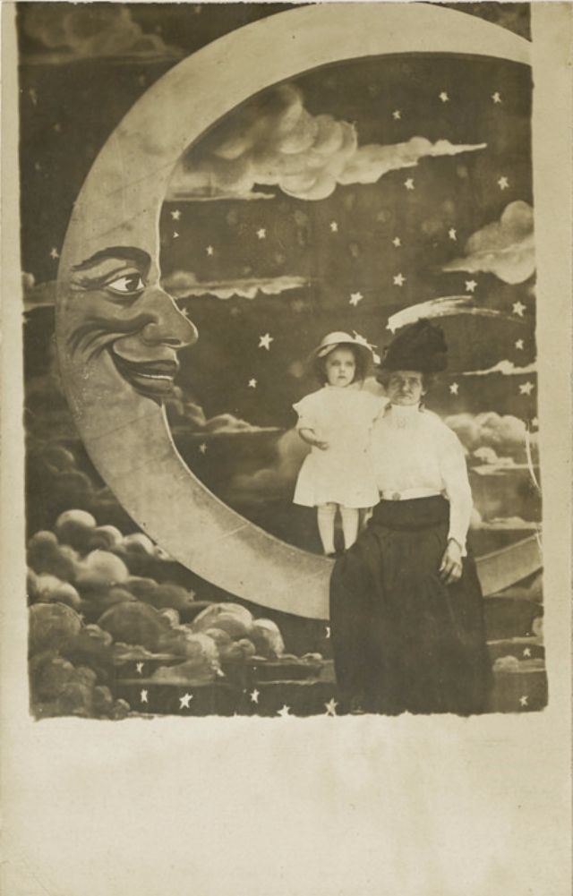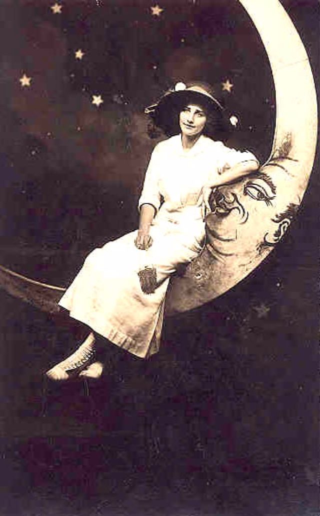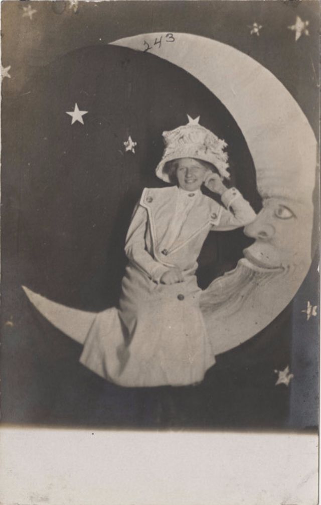 Часто на ярмарках, вечеринках и карнавалах люди сидели на полумесяце улыбающейся "бумажной луны", как бы возносясь к звездам. Фотографический феномен начала 20-го века поразил воображение мира до фотошопа и подарил многим незабываемые образы прекрасных времен.